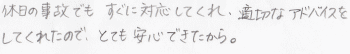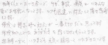 HOME | お客様の声 ■お客様の声 豊橋市 Aさま(夫婦2人世帯) 先日不注意で事故を起こしたのですが、夜間でもすぐに事故現場に来ていただき、事故処理の指示をしてから病院で今後の説明があり、安心しました。 (中略) 長年お世話になっているので、不充分な説明でもすぐに駆けつけてくださる安心感は、これから歳をとっていく者にはかけがえのないものです。 ありがとうございました。 ご利用の保険 蒲郡市 株式会社和宏さま いつも小さな事故でもすぐに連絡がとれ、現場に駆けつけてくれて、迅速かつ丁寧な対応とアドバイスを頂きました。 ご利用の保険 蒲郡市 ホンダカーズ愛知南さま 蒲伸商事さまとは50年のお付き合いをしており、火災保険や事業保険など会社として一括でお世話になっています。 過去、近くの水路が氾濫して思わぬ水害にあった時がありましたが、迅速な対応をして頂き感謝しております。「何かあれば、蒲伸商事さまへ連絡を!」というのが弊社の決まりごとになっています。 ご利用の保険 豊橋市 Kさま 休日の事故でもすぐに対応してくれ、適切なアドバイスをしてくれたので、とても安心できたから。 ご利用の保険 蒲郡市 Iさま(3人家族) 前の保険と比較していただき、保険料が同じぐらいで、補償内容がこちらのが良かった為 ご利用の保険 豊橋市 Kさま 長いおつき合いですが、無理なセールスはせず! 保険請求は迅速に! 最高の代理店さんですよね。 だから新保険の話などは、加入は出来なくても真剣に聴いてあげたくなるんです。 友達等に紹介もしたくなります。 ご利用の保険 蒲郡市 Yさま 全く予期せぬ突然の入院・手術・退院・通院・自宅療養。 担当の佐藤さんに連絡したらすぐに来て下さいました。 保険の書類上のことなど的確なアドバイスを頂き、迅速に対応して下さったので、保険が入金されるまで、とてもスピーディーでした。 当たり前のことですが、入退院すると何かとお金がかかります。 が、佐藤さんの対応が早かったため、結果金銭的に困ることはありませんでした。 (後略) ご利用の保険 豊橋市 Kさま 30年以上のおつき合いで、ケガ、事故、病気と色んな面でお世話になっています。 いつも迅速な対応に感謝しています。 保険は請求等の対応が[一番大切]だと思っています。 保険加入していた[ありがたさ]を感じさせてもらっています。 (後略) ご利用の保険